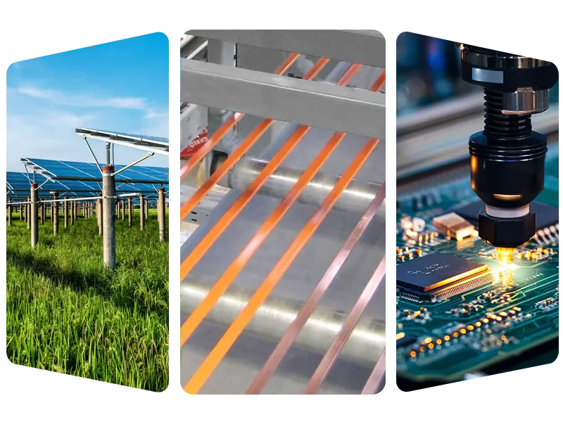 • Raon photovoltaic: cinneasachadh mòr de riobanan tàthaidh photovoltaic agus bàraichean-bus gus co-phàirtean a chuideachadh gus dealan a ghiùlan gu h-èifeachdach.